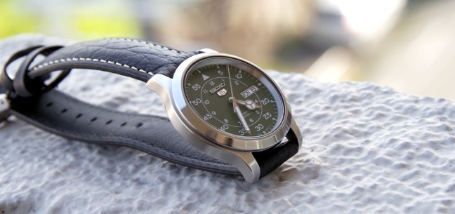 僕の腕にはちょうどいい37mmケースにミリタリー調のON・OFF問わず使える見栄えのいいダイヤル、誤差も気にならない程度の高性能で信頼できる7S26オートマチックムーブメント、防水もちゃんと生活防水で普段起きうる水濡れなら充分安心、しかも比べようもなく低価格。ちょっと磨けばきっと大好きになるSNK。黒ダイヤルの809・ベージュの803に続いて緑の805のモディファイです。(